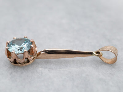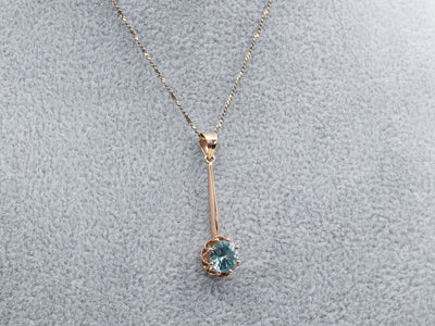 This sleek elongated solitaire pendant is so elegant! Polished lines in 14 karat gold transition smoothly to a sparkling blue zircon drop. Perfect for wearing alone or layered, this piece is ready to wear or gift!
