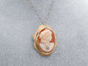 This beautiful vintage cameo pin or pendant features a lovely and proper lady wearing a diamond necklace! She is wonderfully carved with small details. The movement in her curly hair is truly just stunning. She has been set in a simple yellow gold frame which completes the look of this sweet piece beautifully.