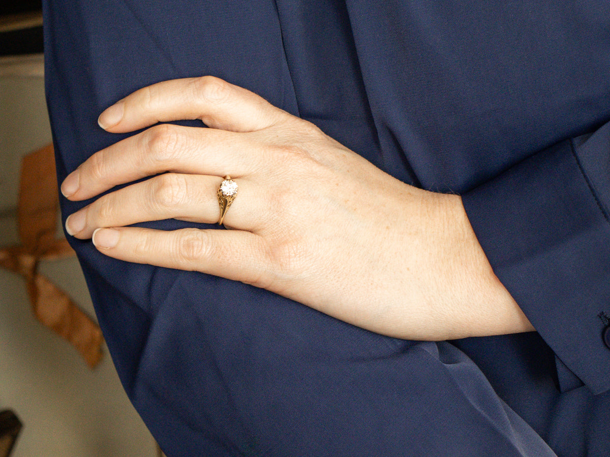 This is a stunning round brilliant-cut diamond filled with fire! We've set this lovely diamond into this delicate antique green gold filigree setting. A beautiful floral filigree ring from the Art Nouveau era. Simple yet intricate, the bright green gold setting has the perfect amount of filigree work, combined with the statuesque four prongs to set off the color of this beautiful 1.07 carat diamond!