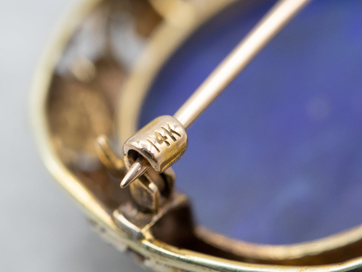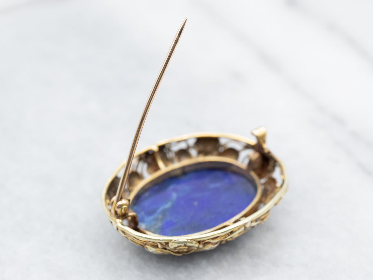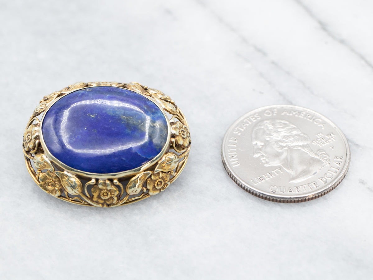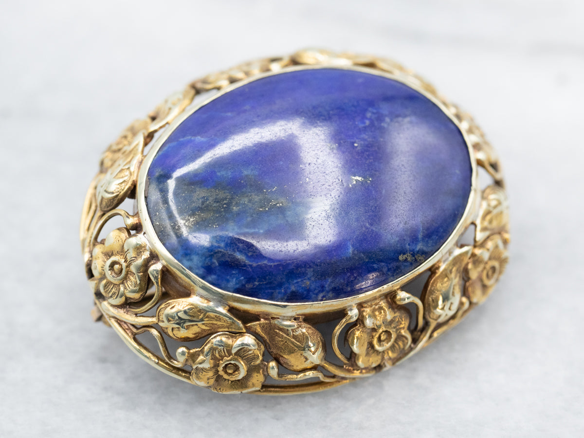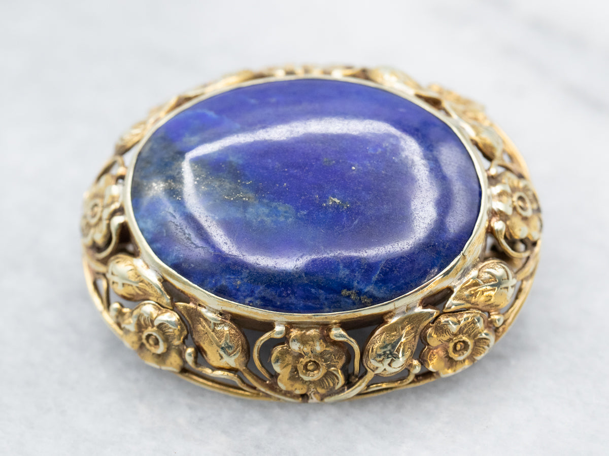 This beautiful piece of Lapis Lazuli has a deep and rich blue color, with lots of flecks and speckles of bright, gold pyrite! Surrounded by a scrolling floral setting with wonderful details, this brooch is a classic that would look amazing worn on a lapel or winter jacket!