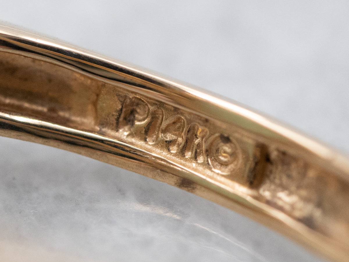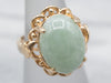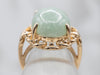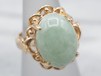 This stunning Mid Century mounting is a rich combination of yellow gold and soft mint green jade. The metalwork around the stone ripples with petal-like scalloping, with just a wonderful polish framing this lovely stone. This would make a great and different cocktail ring, and the color is truly superb!