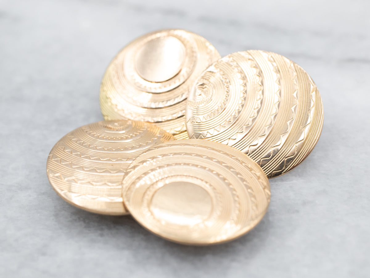 These vintage cufflinks are the very definition of sophistication. The metal is bright, but softly polished yellow gold etched with radiant, pinstriped, and zig-zag patterns.
