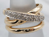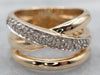 This beautiful band is feminine in style, but with a substantial presence on the finger. Created in the style of a wide, woven band on top, the ornate centerpiece tapers to a balanced, narrow band that is comfortable on the hand. Polished gold swirls and twists, each bit finished with bright round cut diamonds are sprinkled across the white gold adding light and sparkle to this versatile ring!