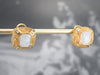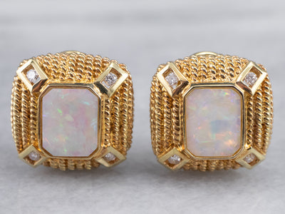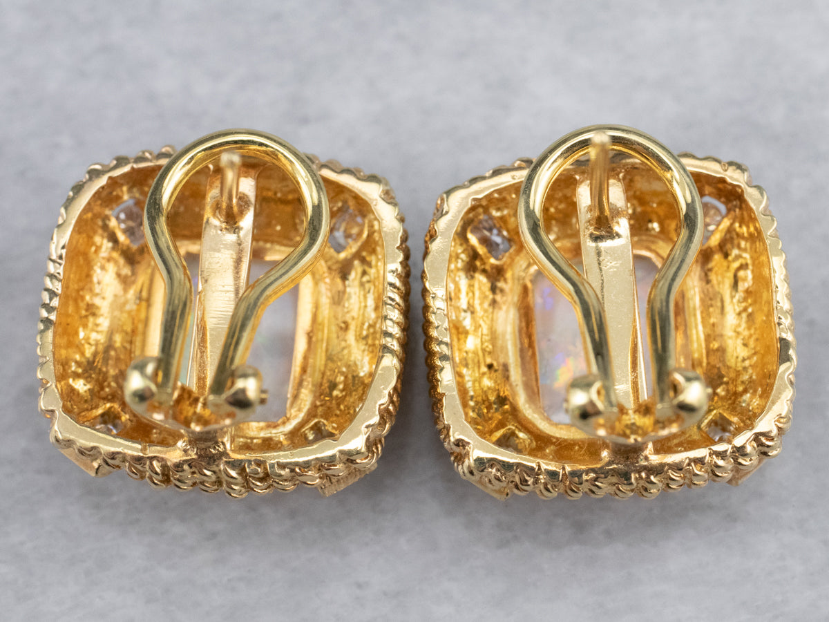 Metal: 14K Yellow Gold Gem: 2 Opal Gem Measurements: 9.3 x 7.5 mm, Emerald Cut Accents: 8 Diamonds totaling .16 Carats, VS in Clarity, F in Color Earrings Length: 16 mm Earrings Width: 16 mm Marks: “585 14KT” Stamped on the Findings
