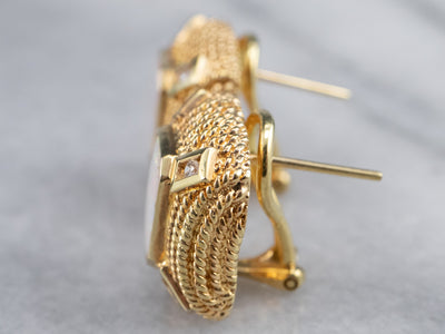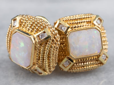 These bold earrings have a lovely presence, with plenty of light coming through the bright opals. A twisting frame of yellow gold gives a nautical style to these earrings, with diamond accents that shine and sparkle like twinkling stars!