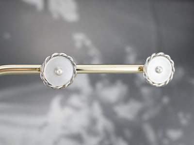 Metal: 14K Yellow Rose and White Gold Gem: 2 Seed Pearls Gem Measurements: 2.6 mm, Round Accents: 2 Mother of Pearl Earrings Length: 15 mm Earrings Width: 15 mm Marks: “14” Stamped on the Reverse