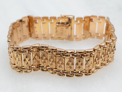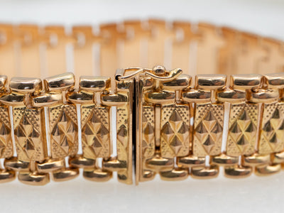This stunning 18-karat rose gold bracelet features beautifully textured links that shine in rich 18-karat gold. It is a perfect everyday bracelet and could also be paired easily with similar bracelets as well. This would make a lovely gift for a birthday, anniversary, or other special occasions!