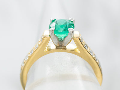 This vintage ring's simple style means it will transition easily from day to evening, office to a cocktail party! The color of the .77-carat emerald in the center is intense, a gleaming beauty with plenty of sparkles. Bright channel set diamonds form an appropriate frame for this pretty gem!