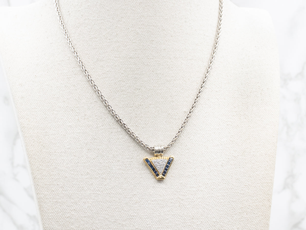 This exquisite vintage Italian-made necklace features twelve channel-set blue sapphire squares and ten high-quality pavé set diamond rounds throughout the center, all elegantly crafted in 18-karat yellow and white gold. Complete with a sophisticated box clasp, this necklace is the perfect accessory for any special occasion.