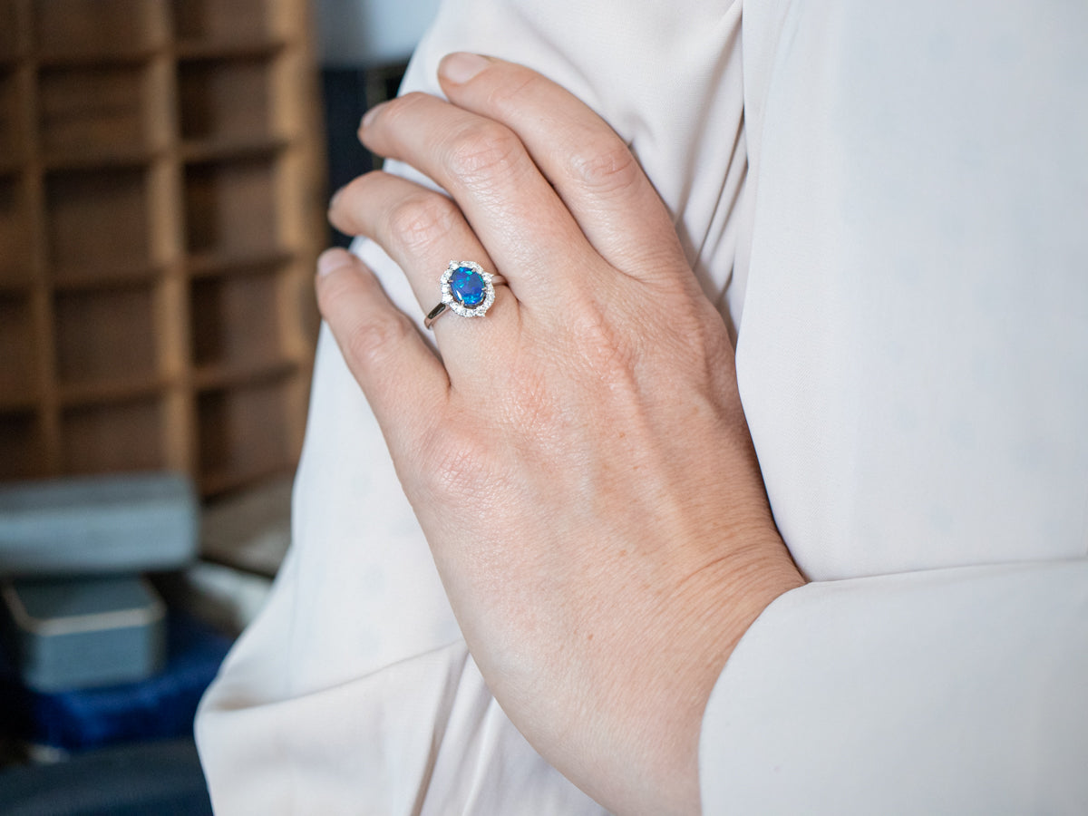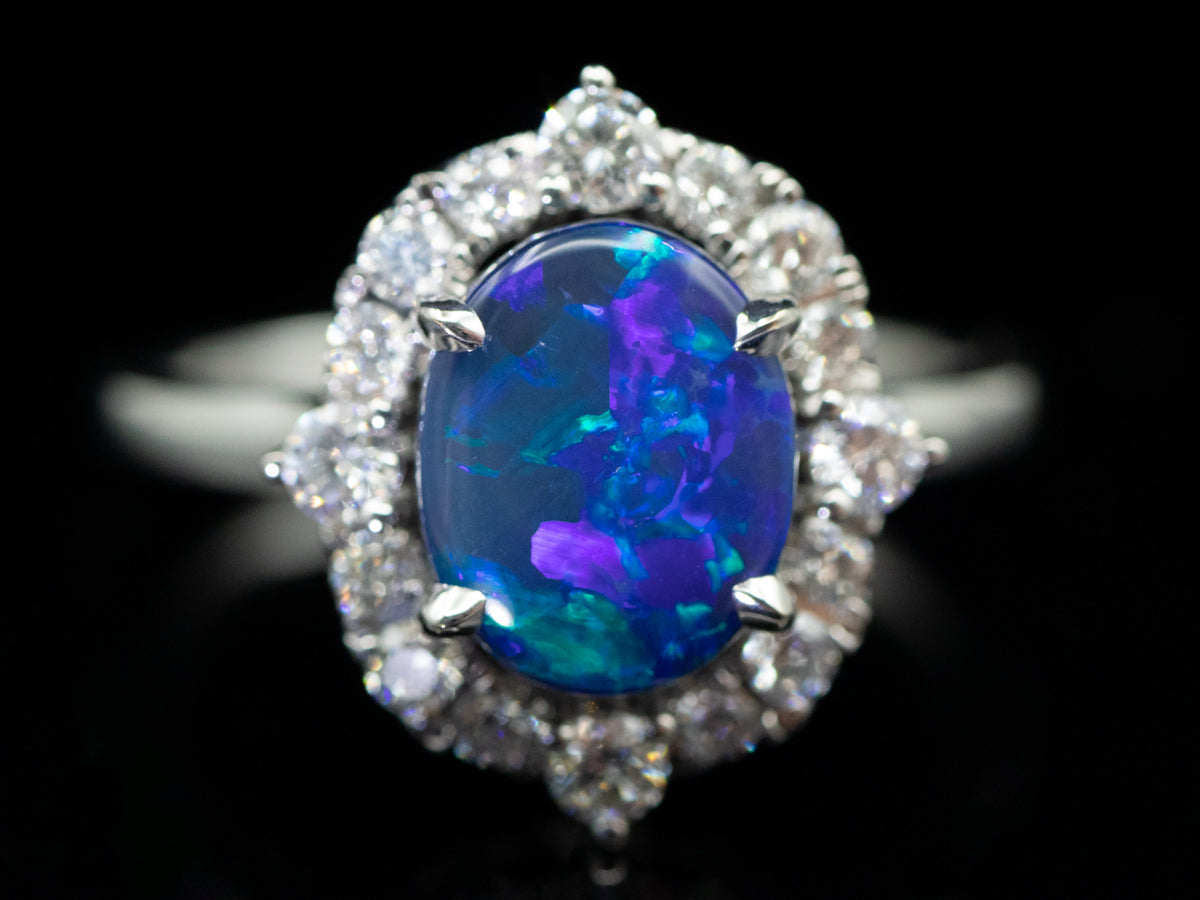 18k White Gold halo ring with plain band and prong set, black opal oval center stone accented by 16 pavé set, diamond rounds along the halo.