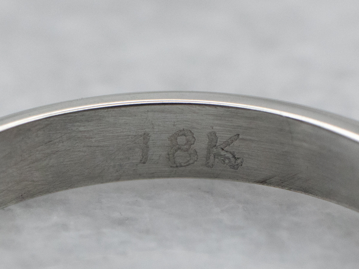 This simple white gold band features a smooth inside and a domed top. This is comfortable to wear, and the balanced silhouette that makes for a nice profile on the hand. This can be worn with a variety of engagement rings, or stacked with other bands!