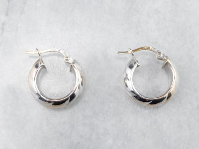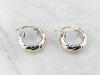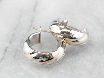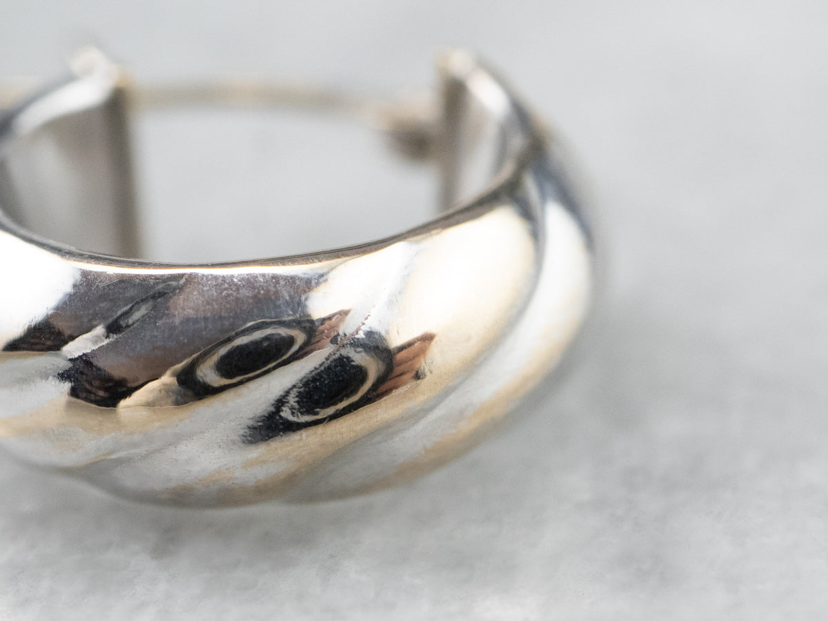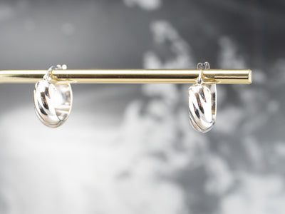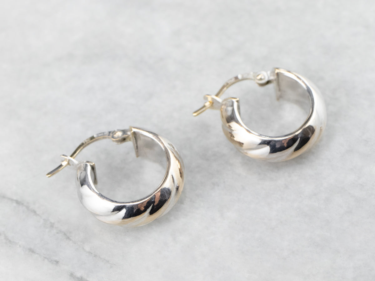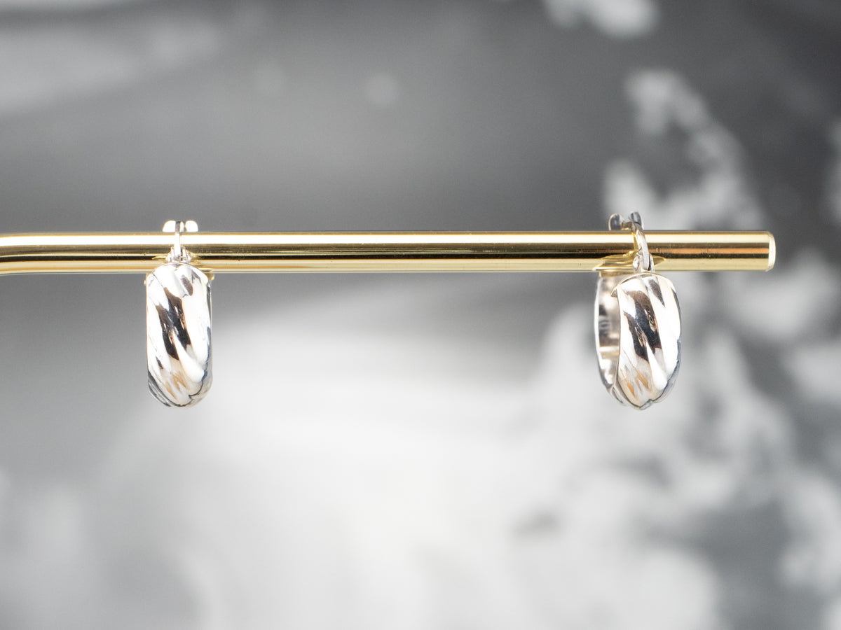 These hoop earrings are classic and versatile! A subtle twist design catches the light and emphasizes the excellent polish of the 18 karat white gold. These earrings are perfect for transitioning from day to evening.
