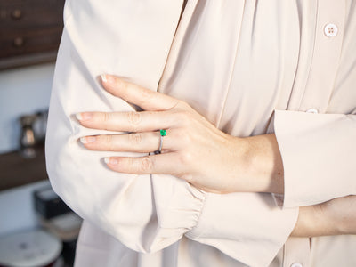 We've set this modern, white gold engagement ring mounting with a pretty emerald-cut emerald! Shades of mint and plenty of light sparkles from within this fine gemstone, while its size is perfectly balanced by the diamond pave set, and 18-karat gold band.