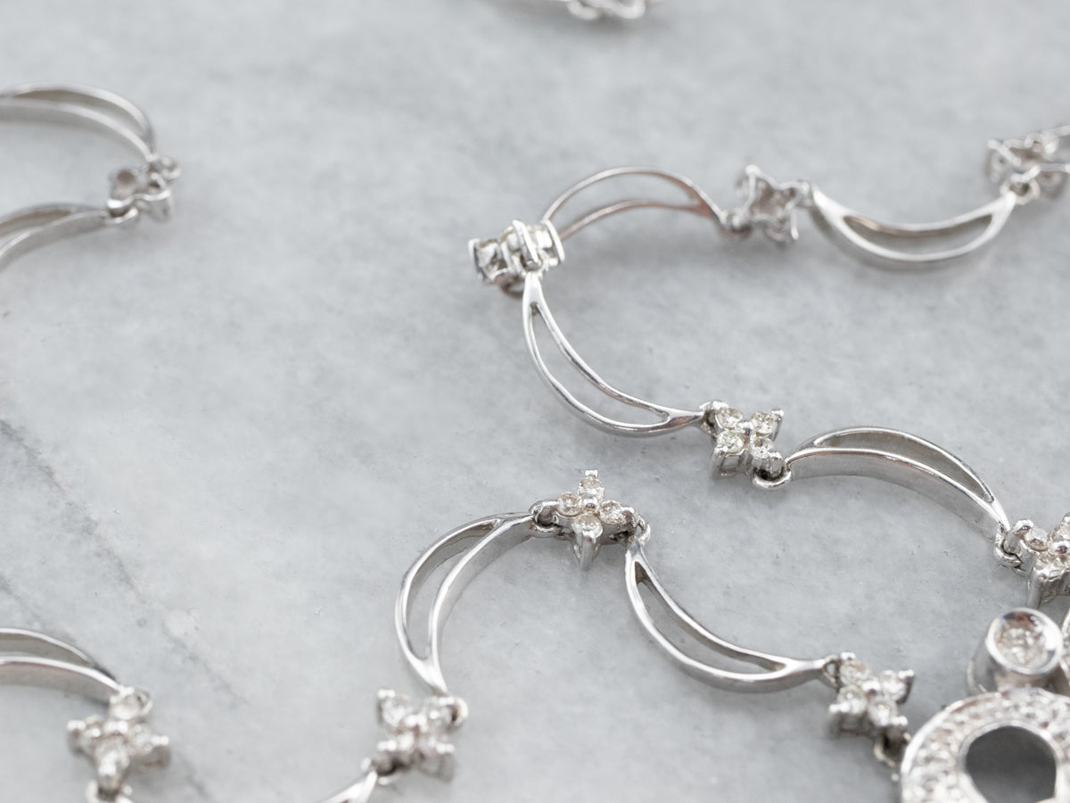 Scrolling floral-shaped diamond clusters sparkle up and down the length of this gorgeous piece! Crafted of highly polished 18 karat white gold, and set with high-quality diamonds, this piece can easily be dressed up or down. We love how this necklace and diamond-encrusted pendant comfortably lays on the chest creating a sleek and simple profile, making it an outstanding piece for a wedding day or anniversary gift!