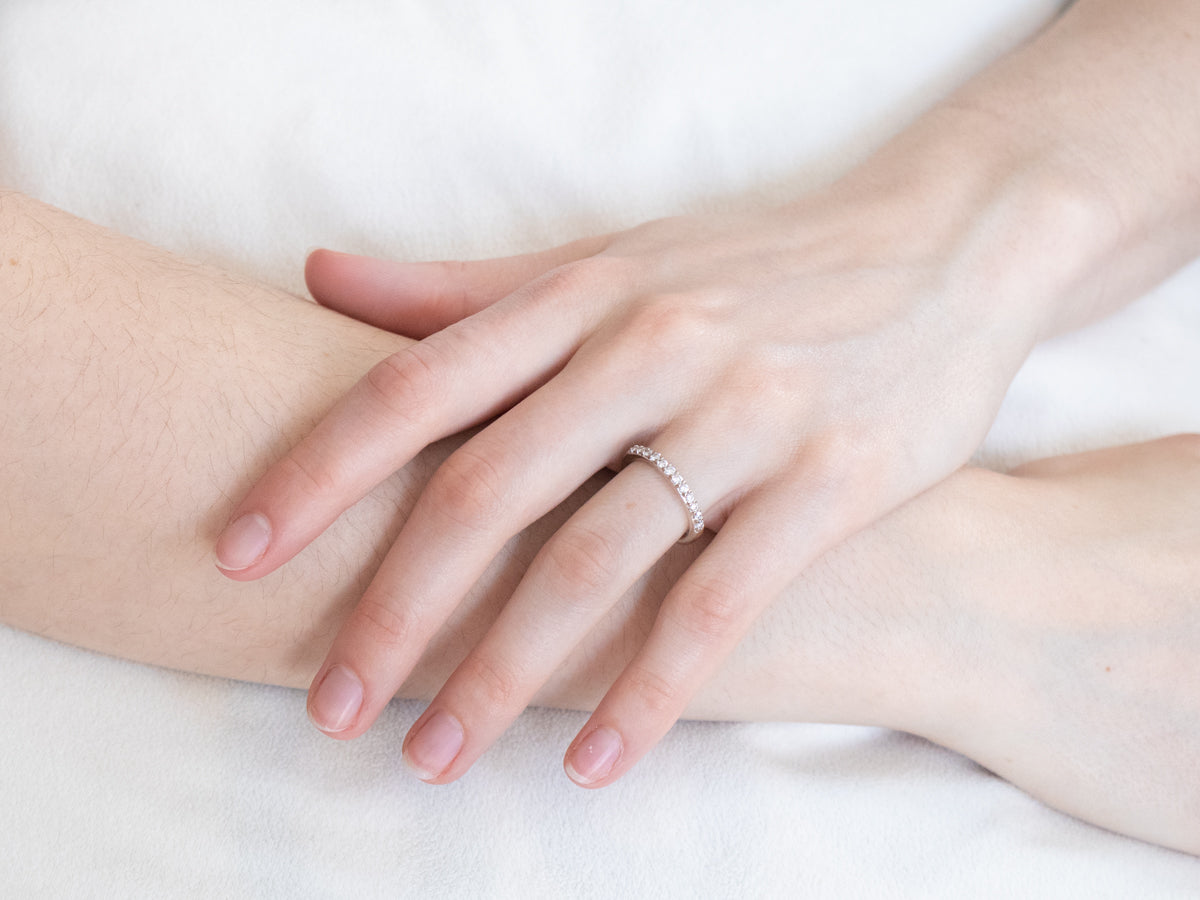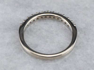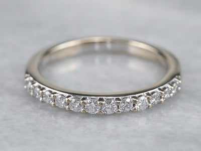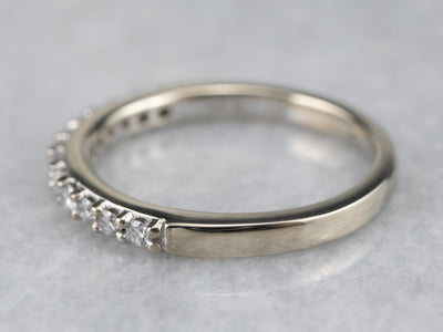 We love the classic look of diamonds set into white gold! This ring is versatile and could be worn as a wedding band, anniversary piece, or stacking ring. Bright and glittering, the diamonds create a row of eye-catching sparkle on the hand!