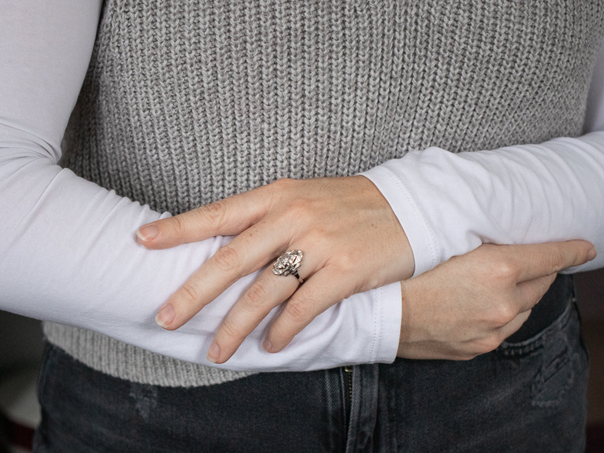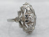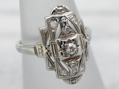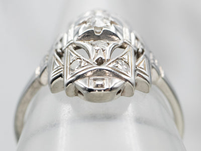 This sweet ring is a bit of an enigma. The style borders the Art Deco and Retro Eras, but fall solidly into neither. The bright cut of the original, high-quality diamonds, however, tells us that this is the 20th Century in origin, and in excellent condition!