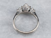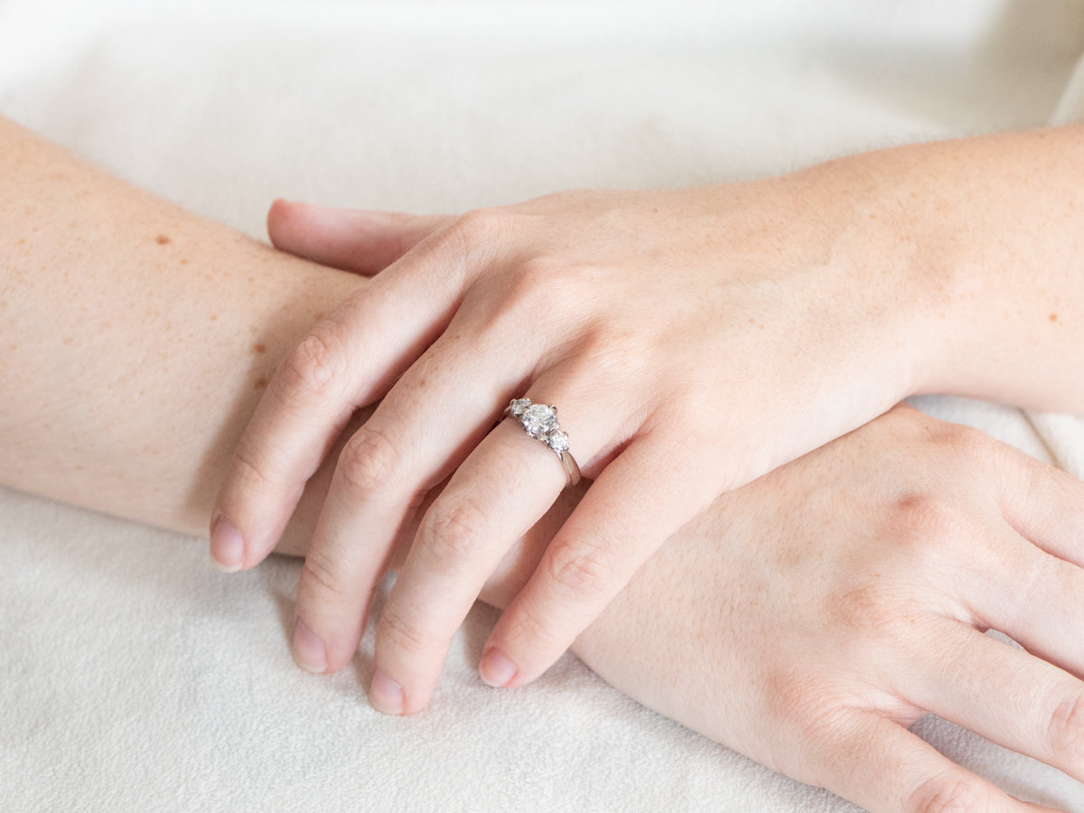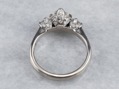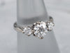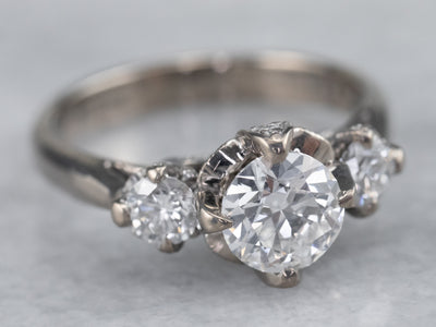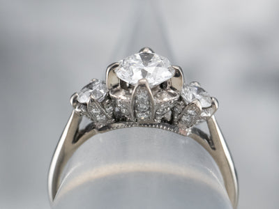 This antique-inspired three-diamond engagement ring packs a lot of sparkles! The three center gems are faceted to perfection, radiating light from their centers. The sparkling diamond mounting envelopes the gems in even more glitter, creating a look that is show-stopping and feminine.