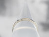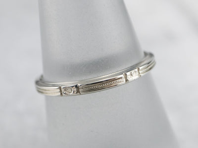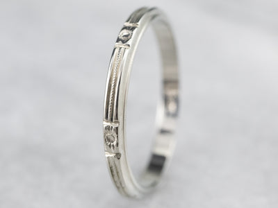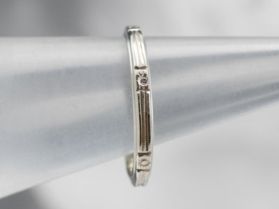 This vintage band has a high dome that is proportionate to its narrow width. The original engraving still forms a bright pattern on all sides of the ring, making a piece that would pair beautifully with a variety of Art Deco engagement rings.