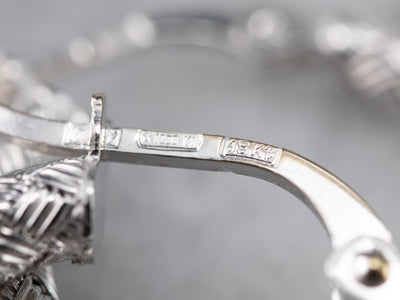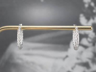 These textured white gold hoop earrings catch the light in an excellent way! These are substantial in look but lightweight and easy to wear. The locking back closes securely, and the basketweave finish is bright and gleaming!