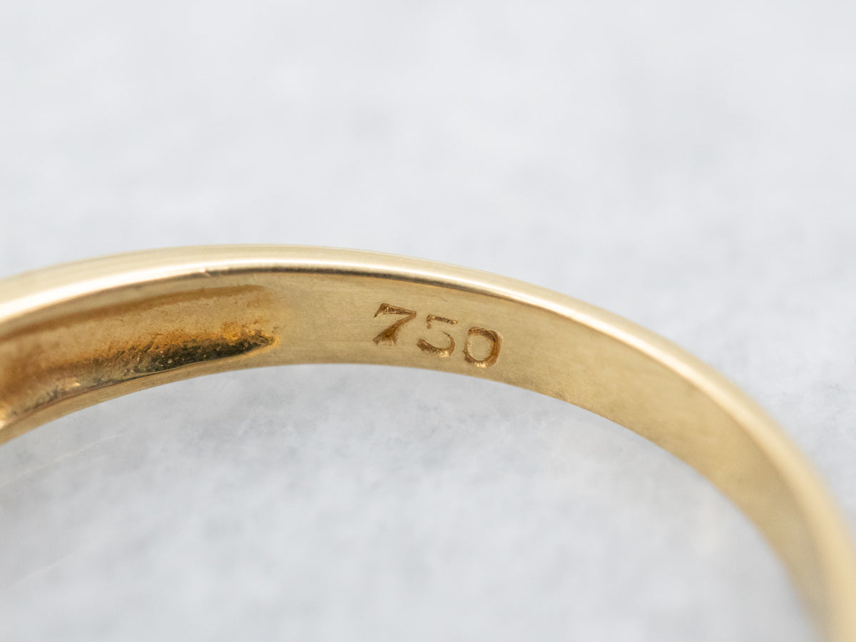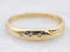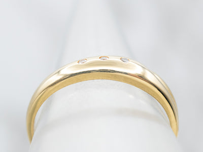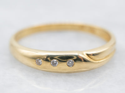 Also, known as a gypsy setting, this bezel set three-diamond band is beautiful in its simplicity! The three diamonds sparkle and twinkle next to the polished yellow gold, which radiates with warmth. This versatile ring could be stacked with other rings, or worn as a wedding band!