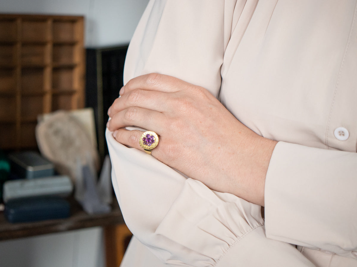 Talk about a statement piece! This high quality 18k Yellow Gold modernist cocktail ring features a textured round top with 7 pavé set, faceted amethyst rounds clustered at the center. The round top is bold and takes up a large amount of space on the hand.