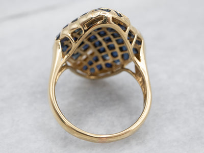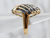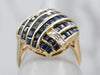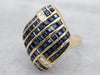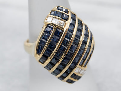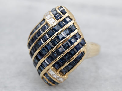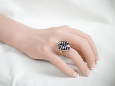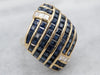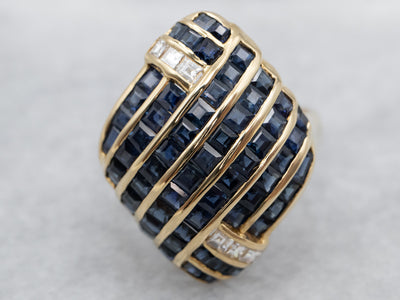 This is a modern and attractive design for a statement or stacking ring. The sapphires are deep blue square cut gems with a great navy blue color! Flanked alongside the sapphires are brilliant white diamonds, all square cut which extends down to a yellow gold setting.