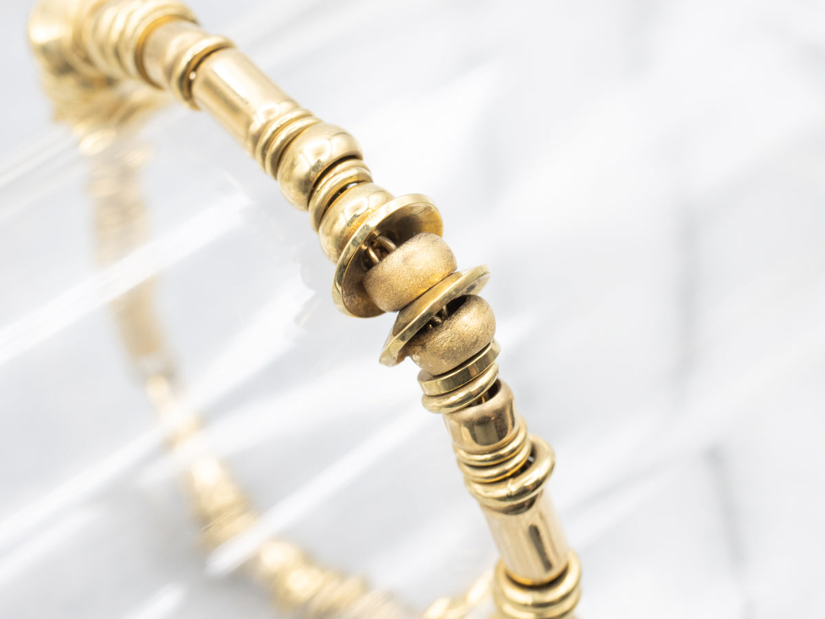 This vintage designer piece exudes elegance and style. This 18-karat yellow gold gives this Robert Hallett Goldsmith bead bracelet a touch of luxury, while the gold disc, sphere, and cylindrical beads add a timeless charm. The hook clasp adds a sophisticated touch, making this bracelet a must-have for anyone seeking a distinctive and luxurious accessory.