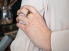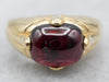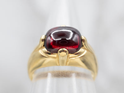 This stunning solitaire ring, crafted from 18-karat yellow gold, features a vintage design with a prong-set garnet cabochon rectangle center stone, giving you a touch of luxury and sophistication. The plain band adds a timeless element to this one-of-a-kind piece, making it the perfect addition to any jewelry collection.