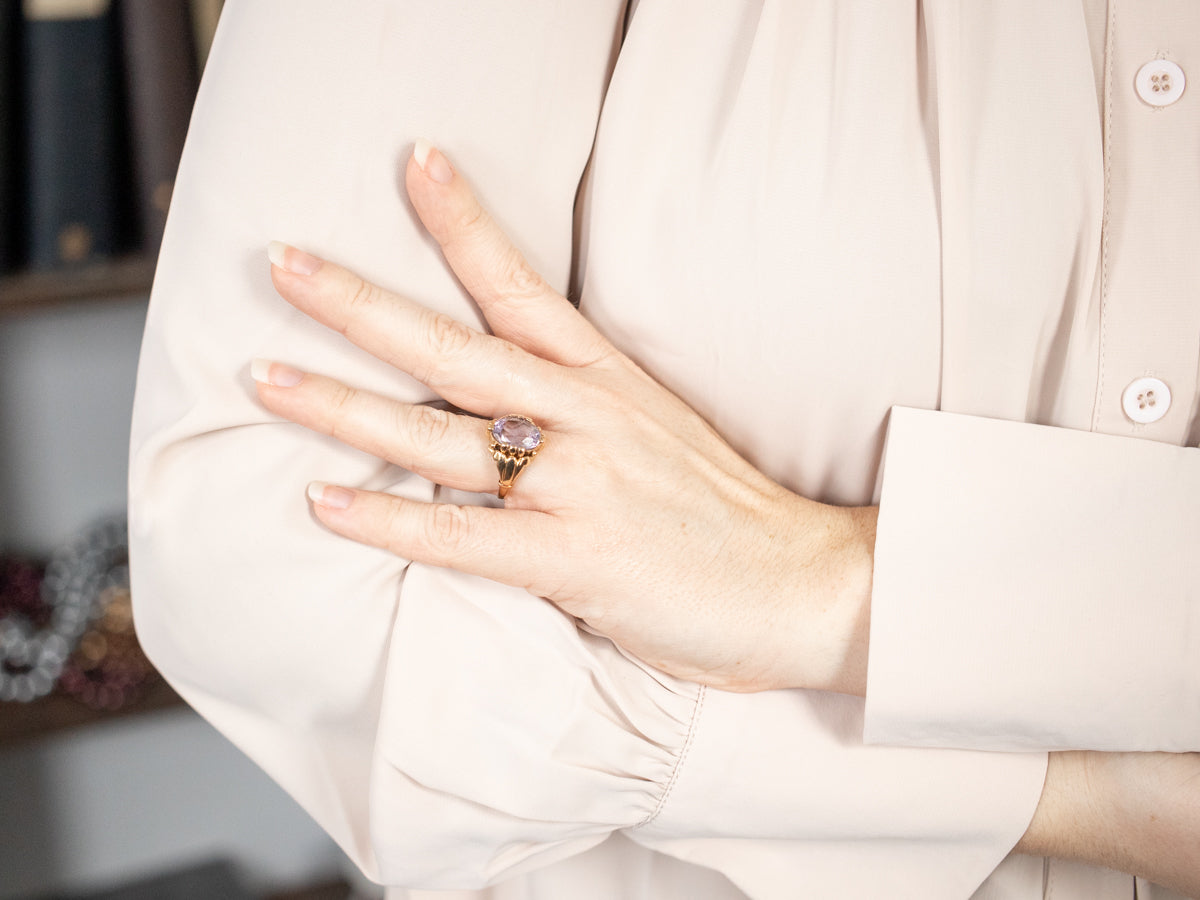 This ring is truly gorgeous! A beautiful deep purple amethyst sits in the center, with an amazing cut and a sweet light purple color that flickers with bright pops of violet. The stone is expertly cut to really display the stone’s color and sparkle. The sweeping yellow gold mounting and sturdy prongs are all this stone needs to frame it to perfection.