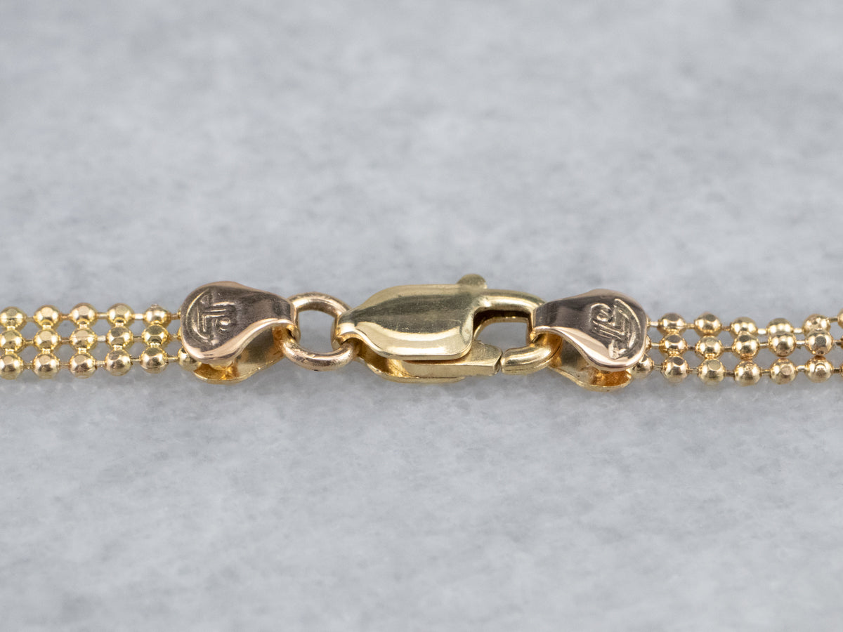 This three-strand chain is substantial enough to wear alone, but could make a bold statement with the right pendant as well! Crafted of 18 karat yellow gold, this chain is comprised of strands of tiny beads, giving it a great play of light on the skin.