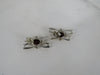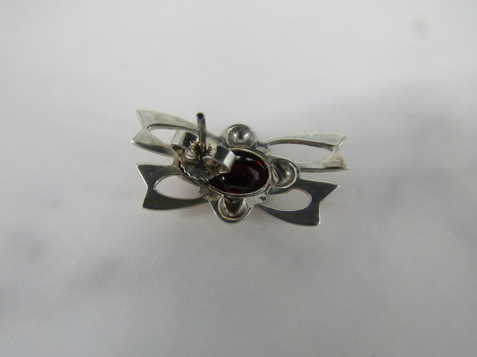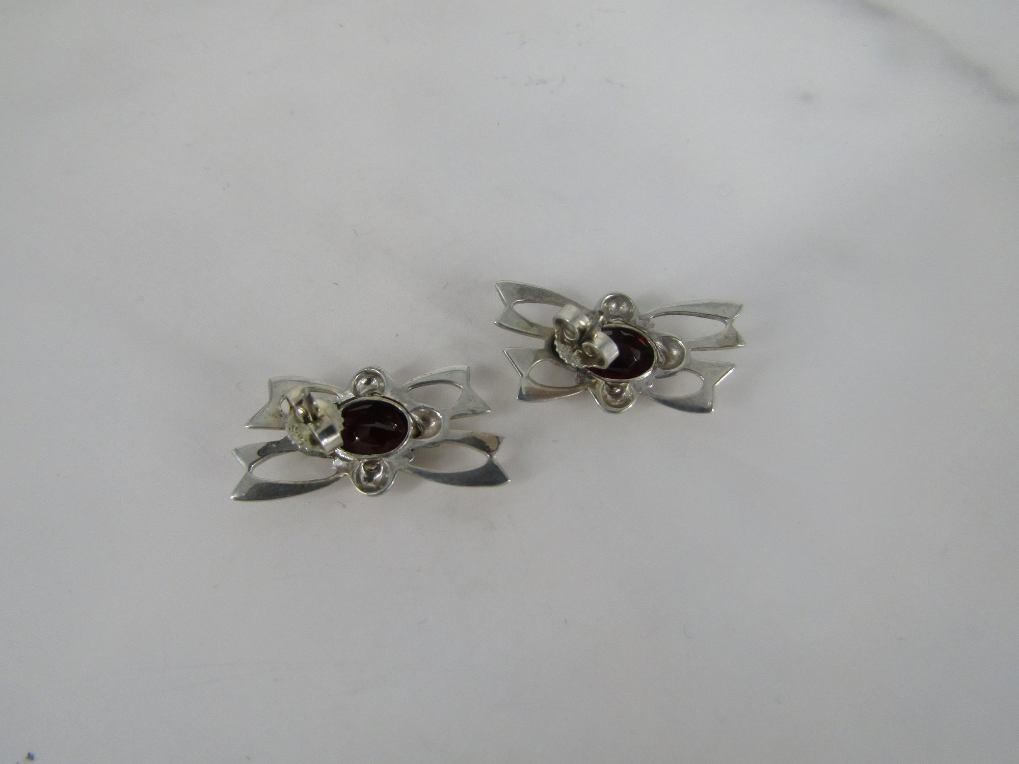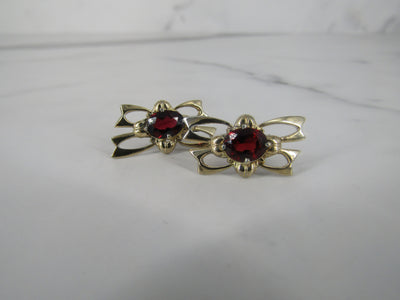 Sterling Silver, gold open work stud earrings with faceted garnet oval center and post backing.