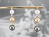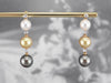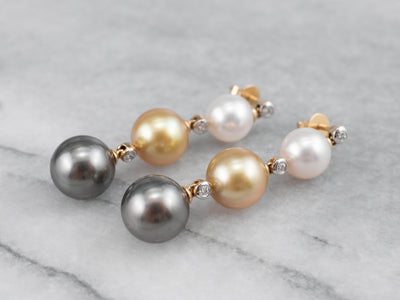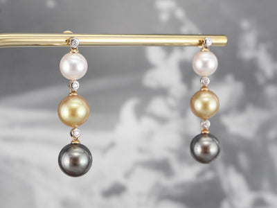 These multi-color pearl drop earrings are perfect for a special occasion! The pearls are Akoya white, south sea yellow, and Tahitian grey pearls with a bright luster that brings out the warmth of the yellow gold. Diamond accents add a touch of glamour with sparkle and light!