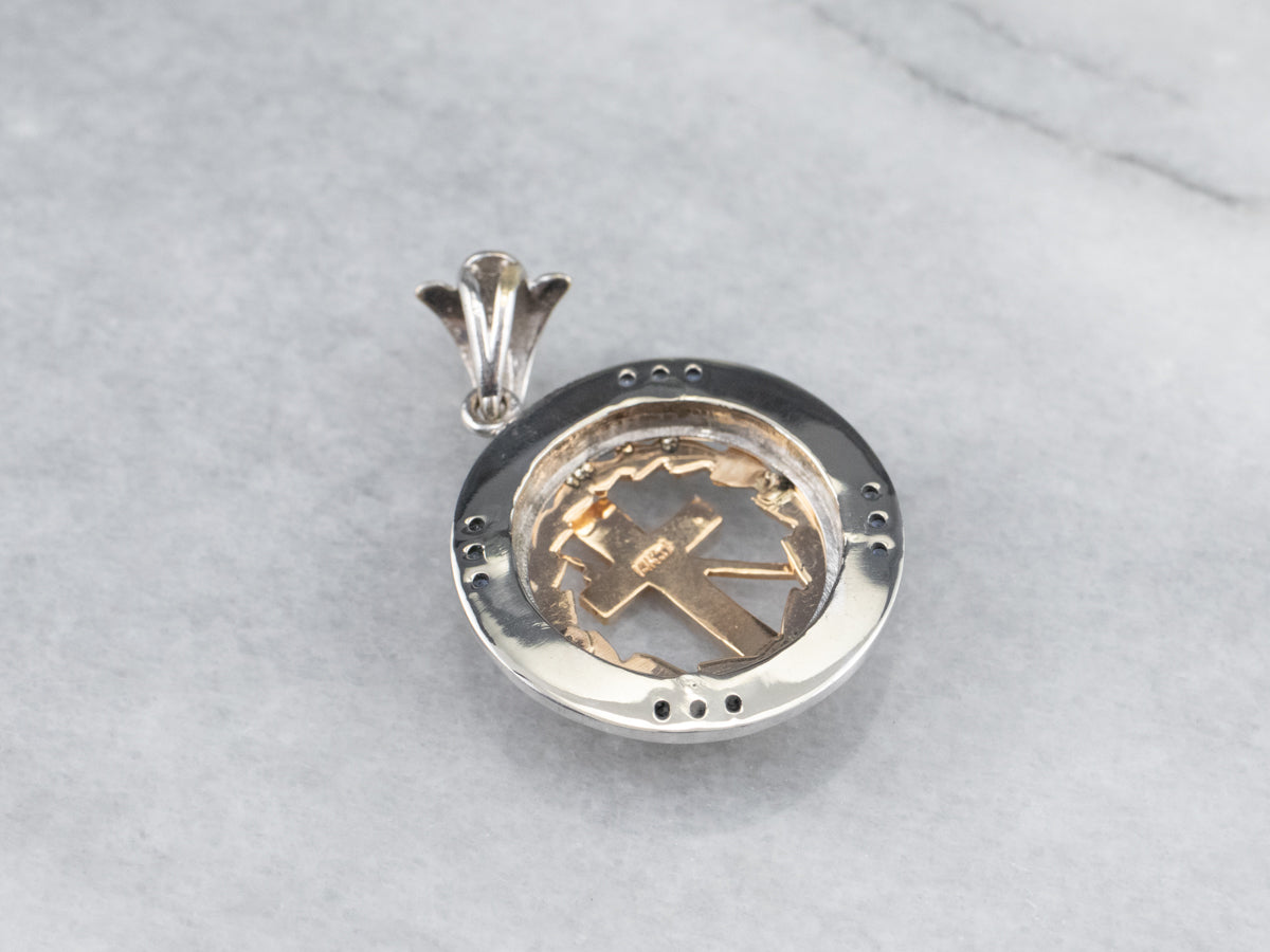 Antique meets modern in this two-tone mix-era pendant. The cross features polished edges, and bright seed pearls paved across this antique cross, centered in a laurel wreath, we have set this once lapel pin into a sapphire frame of polished white gold, a unique religious piece, ready to wear or gift!