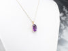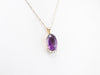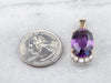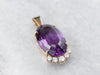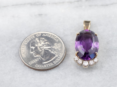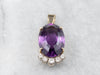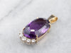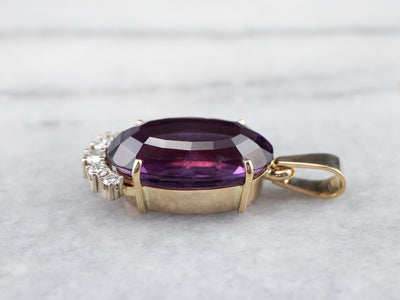 This rich deeply hued amethyst is filled with light, thanks to the excellent cutting. The precise faceting brings glitter and shines all the way into the center of the gem, revealing raspberry and hyacinth flashes of colors. Set into a two-tone gold mounting accented by sparkling diamonds, we just love the sparkle and hues of this piece!
