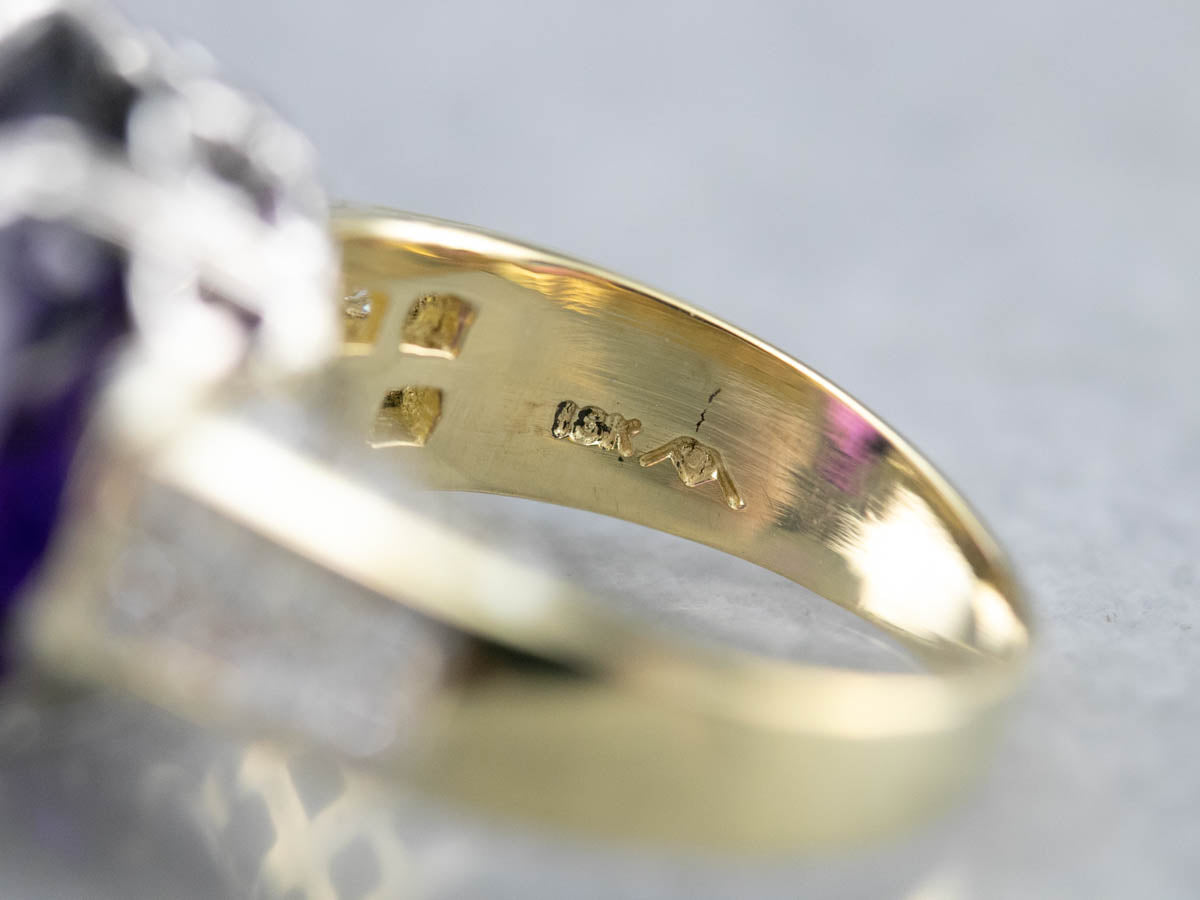 This stunning amethyst cocktail ring has a deep purple amethyst in the center, that really flashes and flickers with vibrant violet reflections! Two rows of square-cut diamonds add sparkle, while round-cut diamonds line the shank of the yellow gold band. Set into a lovely mounting with structurally designed shoulders and a fleur de lis platinum head, this bold statement ring is a beautiful addition to anyone’s collection!