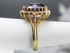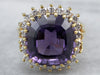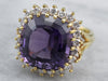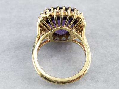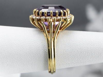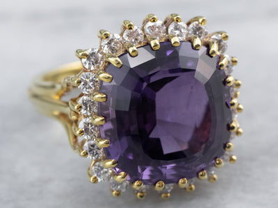 The halo style is pretty and bold, both framing and protecting the stone with the protective prong setting surrounding the diamonds and multiple prongs encasing the stone. This is one of our finest amethyst, a natural stone, deep purple, with fine, bright blue highlights. Outstanding in quality and construction, wearable and versatile.