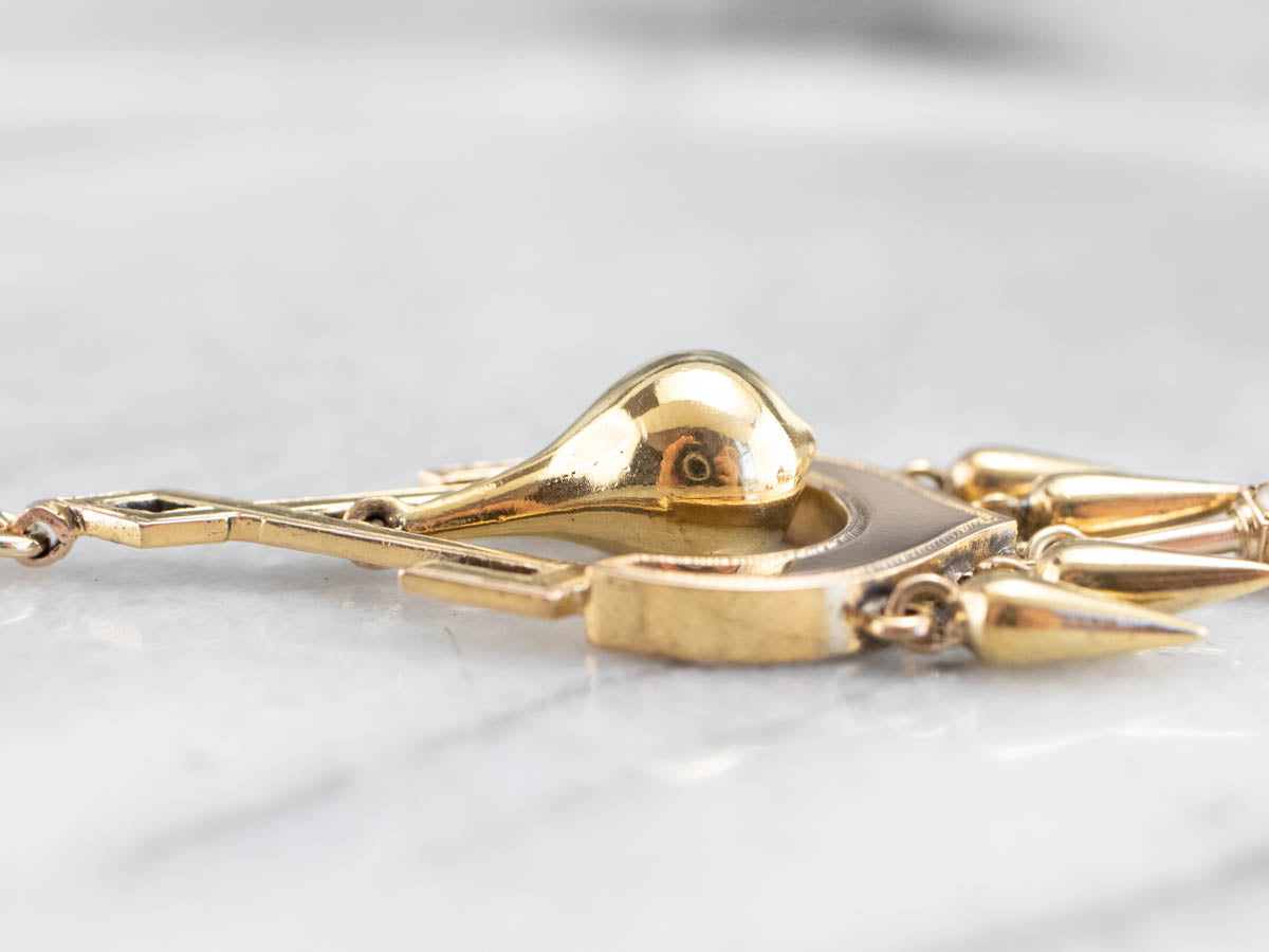 This pendant is crafted of warm yellow gold, the centerpiece is a swinging teardrop of polished gold, a perfect complement to the elongated mounting. We love the grace and drama of this piece, the deeply hued amethyst cabochon, and the overall sense of movement it has when worn!