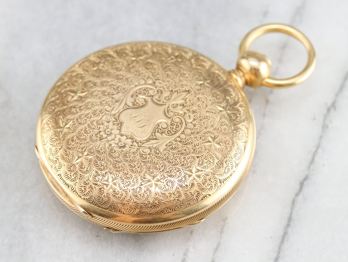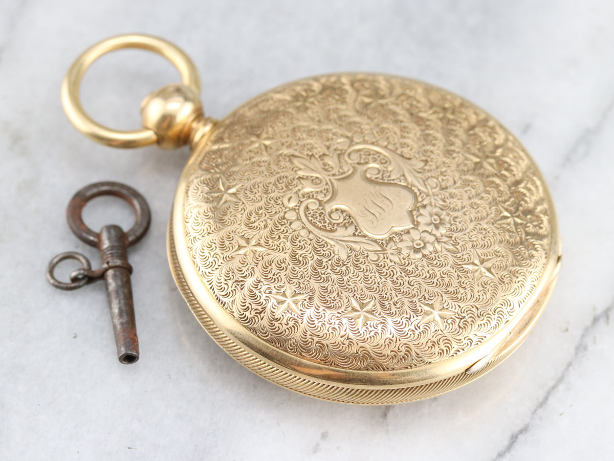 This is the most exquisite pocket watch we've had the opportunity to offer, in perfect condition, this is quite the collector's piece! This antique pocket watch dates to the 1860s, by the J.W. Tucker San Francisco watch company. The face bears two dials, one for seconds and the other for minutes and hours; black, simple hands and stark Roman Numerals. This is a hunter's case, beautifully ornate, one side has blooming flowers in its center while the other has a shield design with a scrolling "LLI" monogram in flowing French script. This piece also has its original key, what a treasure!