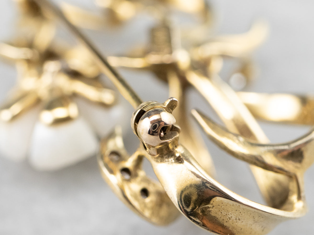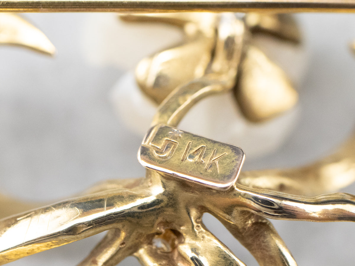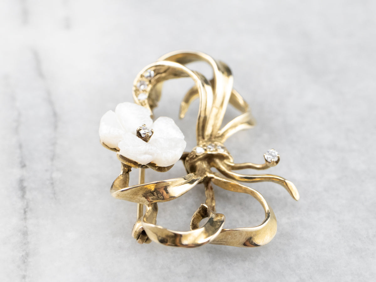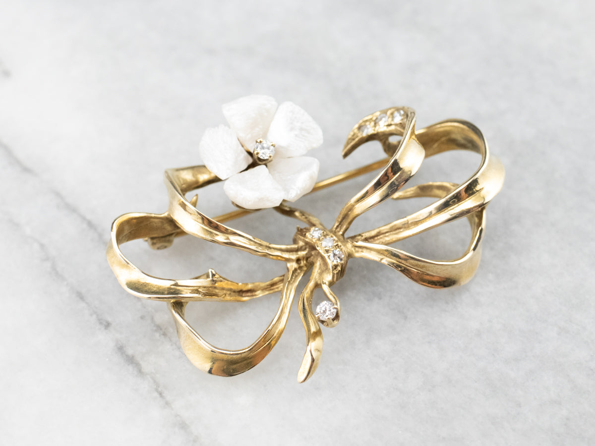 This antique brooch is crafted of polished and patinated yellow gold, set with sparkling diamonds in a scrolling ribbon motif with its centerpiece flower crafted of Mississippi pearls and diamonds, truly stunning! Until the turn of the century major rivers, especially the Mississippi, were filled with pearl-producing mussels and clams. The pearls were often used in jewelry, particularly the ornate lavaliers and brooches of the early 1900's Belle Époque era. These historical pieces are becoming quite rare, as buyers recognize the value of something straight from the earth which can not be reproduced.