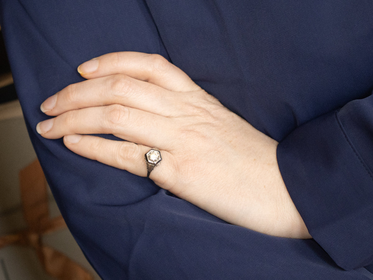 This engagement ring is full of Art Deco finery! The hexagonal head is a striking frame for the newly set round brilliant diamond, which has exceptional fire and sparkle and weighs in over a full carat. Architectural style filigree and wheat patterned accents complete this show-stopping piece!