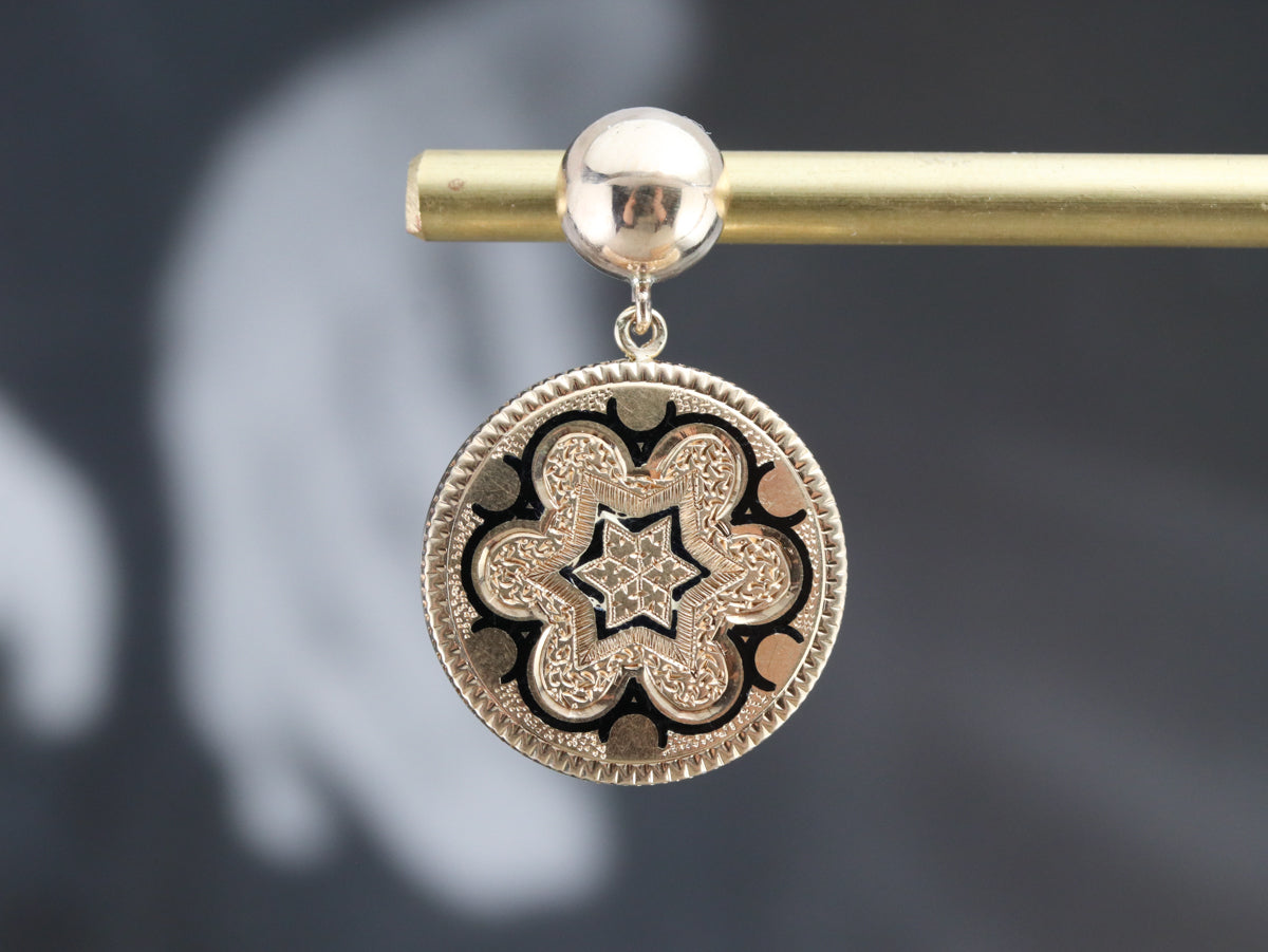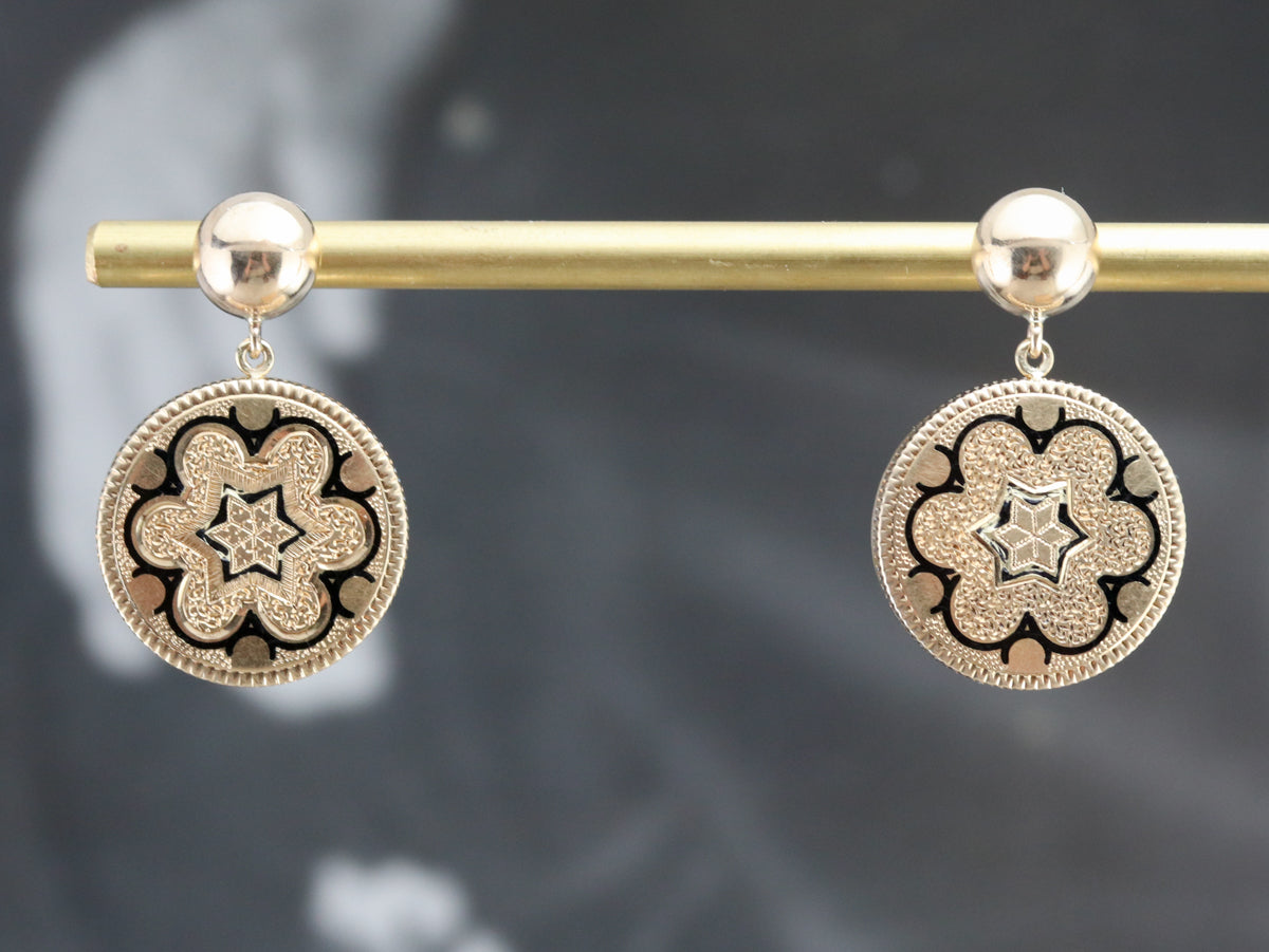 These beautiful earrings were handcrafted by our studio, using pieces of antique cufflinks! The handsome, sophisticated dangles are crafted of yellow gold that is chased with beautiful enamel details! These date to the Victorian era! We've created bails and hung them on smooth, domed post backs of yellow gold.