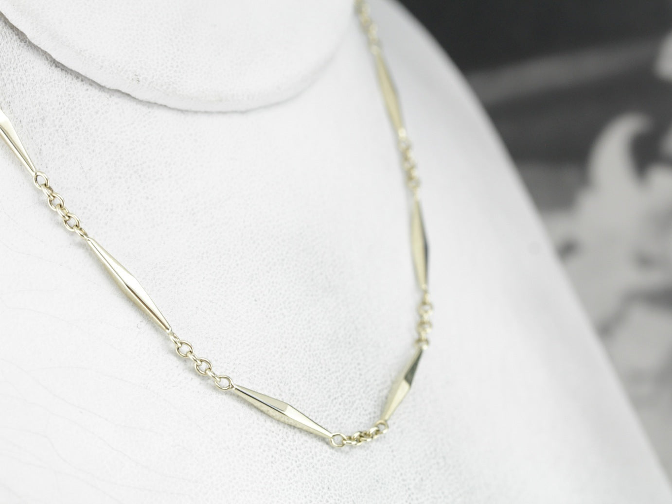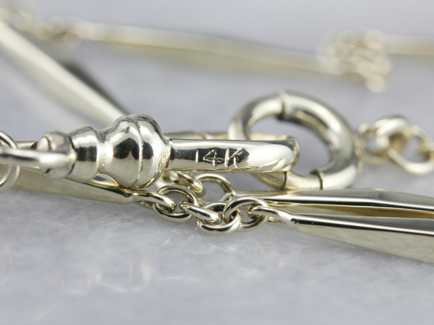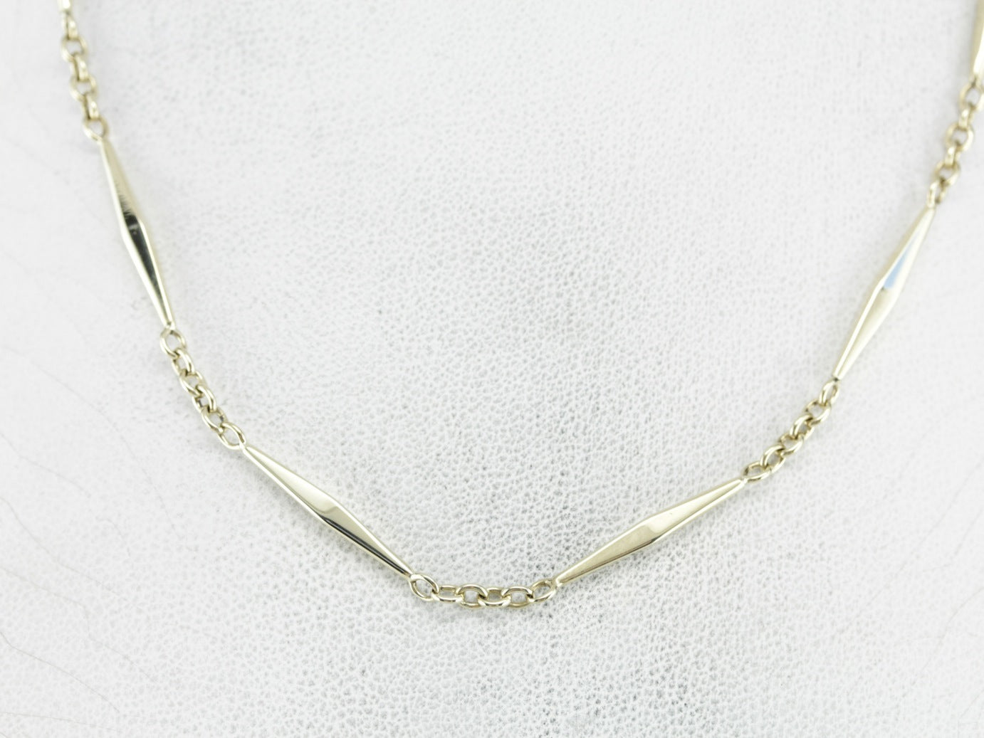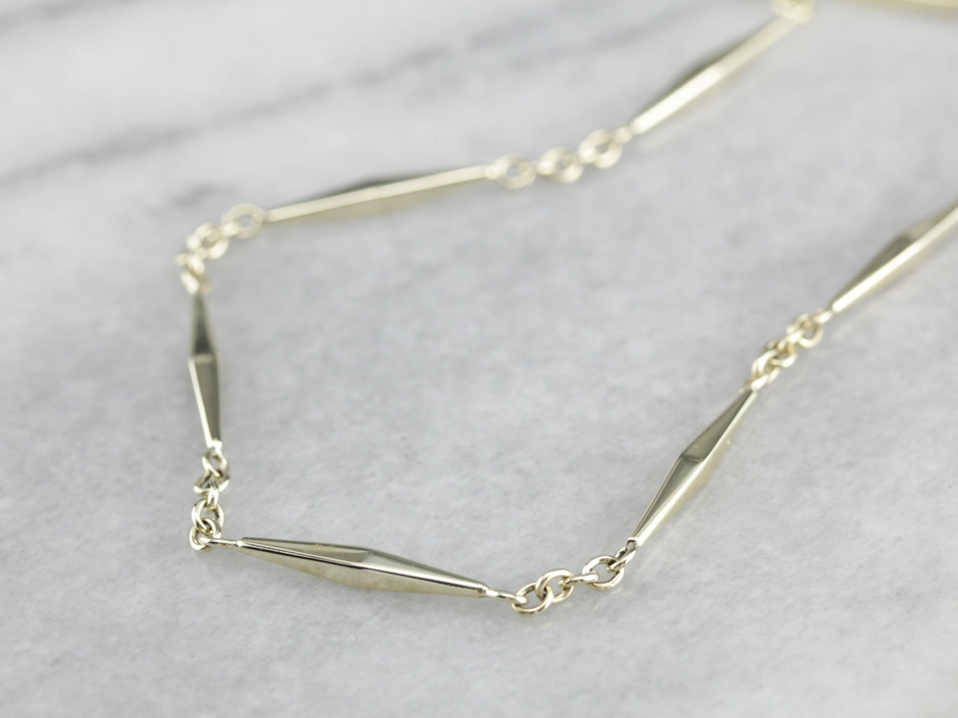 This antique green gold chain is gorgeous, with elongated marquise-shaped bar links and smoothly moving clasps. The craftsmanship is superb, each piece forming a tiny work of art.