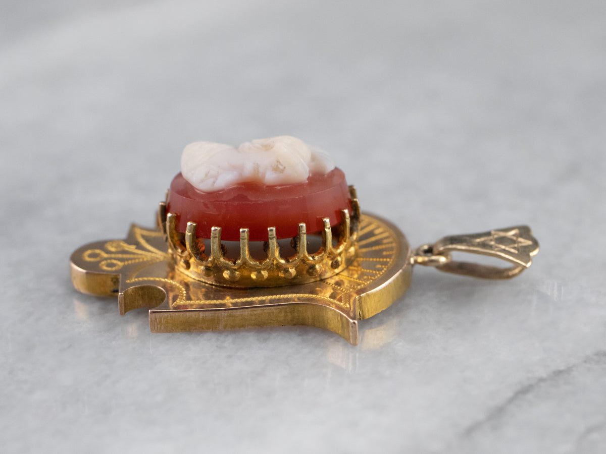 Crafted in the late 1800s, this antique cameo pendant features delicate milgrain and beadwork, bloomed gold, and styling that is the hallmark of the Etruscan Revival style. The ruddy red and white stone cameo is hand-carved, depicting a portrait of a Roman soldier in traditional garb.