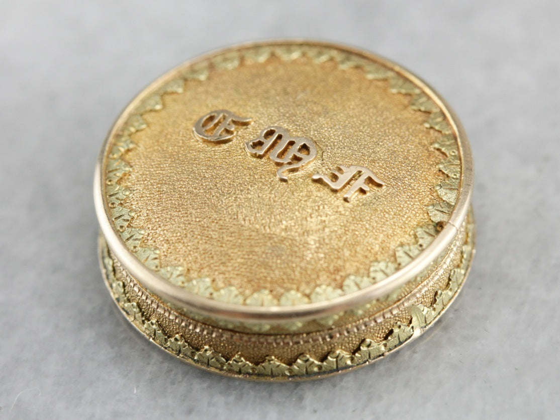 What a stunning little antique treasure! This late Victorian pill box is completely ornate with a textured yellow gold base and a green gold lace-like motif, the center has the original owners initials in classic Old English font!