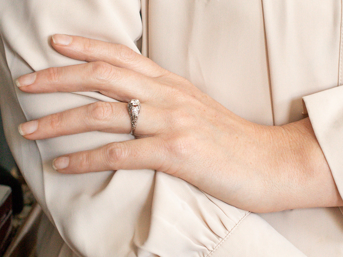 Balanced with immaculate care against the substance of the center stone, the shoulders of this antique ring have a wonderful Art Deco style. Scrolling delicate-looking filigree and milgrain details gives the setting impact without size. Crafted of polished platinum, this ring is one of our favorite pieces in the showcase!