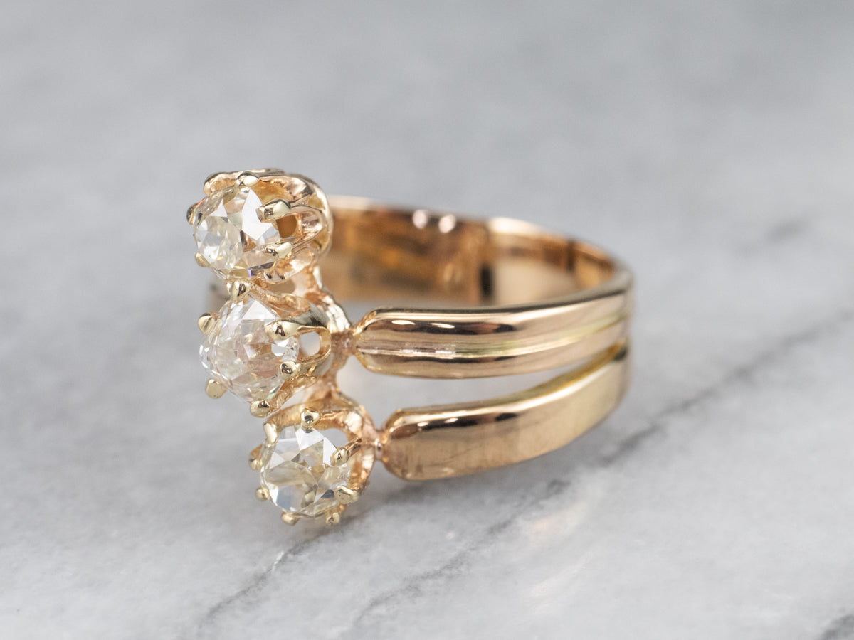 This antique piece contains some of the finest quality materials available. The center has been set with lovely old mine cut diamonds. These stunning gemstones throw incredible light and fire back at the viewer. These are set into a yellow gold bypass style mounting that accents the white of the stones and is sturdy and protective at the same time. This outstanding three-stone ring will look fantastic stacked with other bands, or worn alone as a singular, antique engagement or anniversary piece!