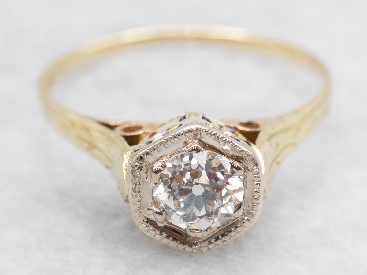This antique engagement ring exudes elegance. The timeless Old Mine Cut diamond shines brilliantly as a single stone, making it the perfect statement for any engagement. With its intricate filigree, every bride will feel special wearing it for years to come!