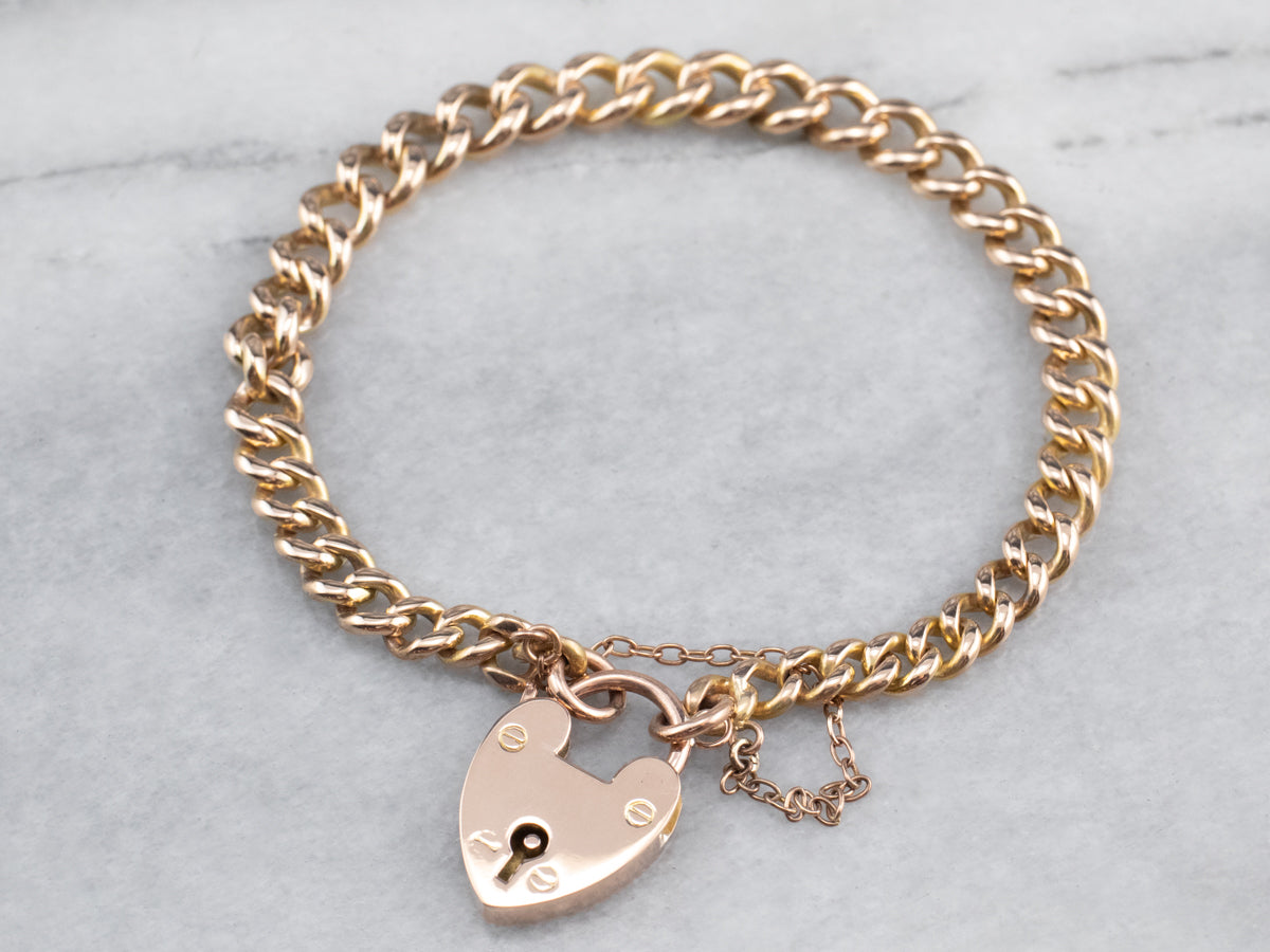 This early 20th century bracelet is a classic design! Crafted of British 9 carat rose gold, this chain has a soft, romantic finish, and is secured with a heart shaped lock. A safety chain helps keep this bracelet secure when worn.