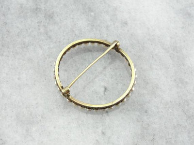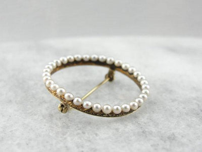 Absolutely lovely, this antique, Art Nouveau Era green gold brooch features hand engraved detailing around the edges. The pearls gleam with luster and light, giving this simple, antique brooch a refined and luxurious feel.