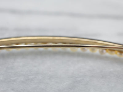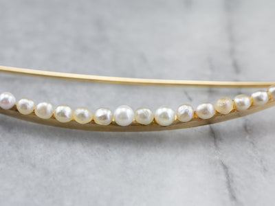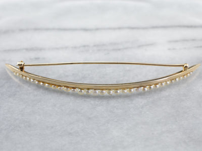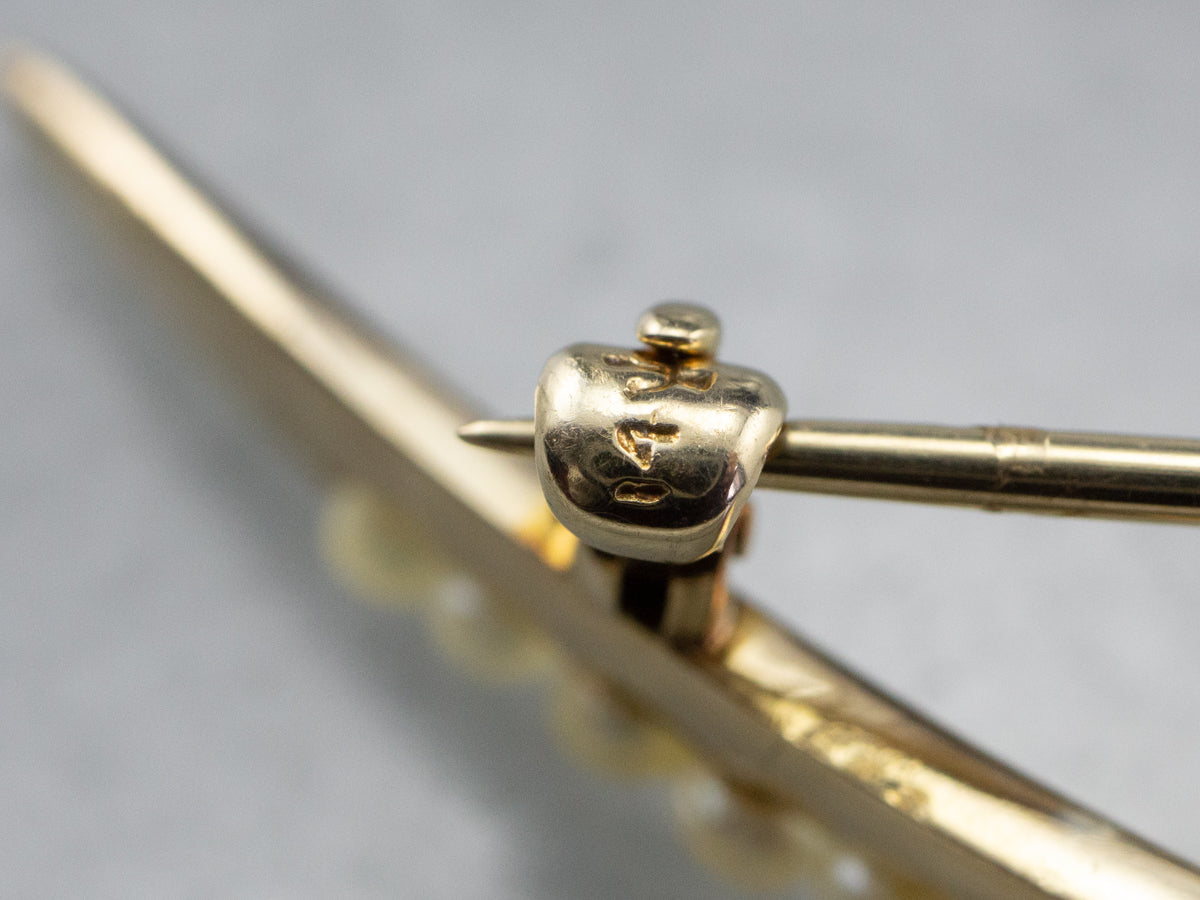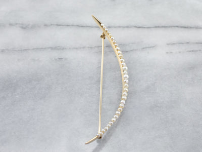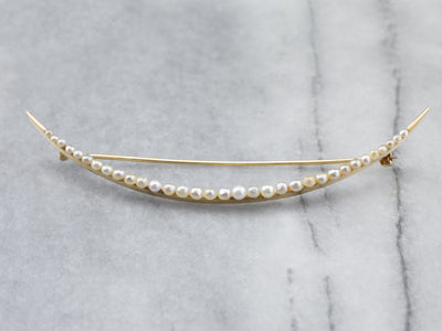 This Art Nouveau brooch features a popular symbol of the era: a crescent moon! Moon pins wear often given to brides to wear on their honeymoon, love tokens of the day. Elongated and feminine, this moon is set with tiny seed pearls, shimmering with ethereal beauty.